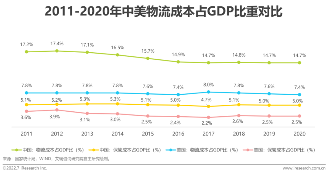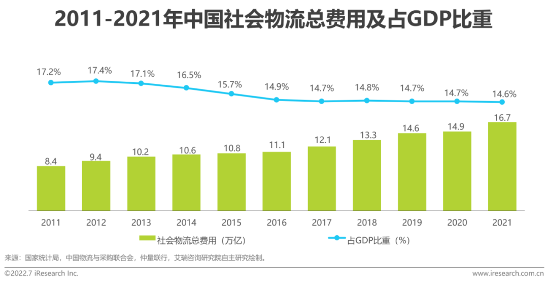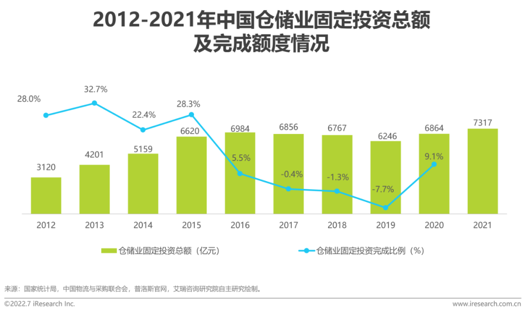近几年基于国内物流行业的稳健增长,拉动物流仓储费用逐年提升。2021年中国物流保管费用达到了5.6万亿元,同比增长了8.8%,占物流行业总费用规模的33.5%,但高端物流地产设施缺口仍然明显。目前物流地产领域的投资规模整体成上升趋势,但涨幅逐降,物流地产正由“增量时代”迈入“存量时代”。