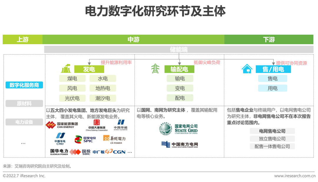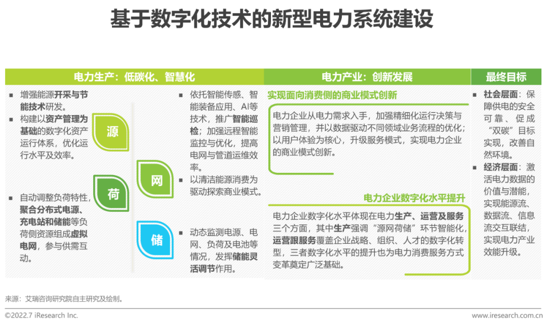 聚焦上游数字化服务商及中游发电企业、两大电网转型实践数字化技术渗透至电力产业“发-输-变-配-用”各个环节。从转型主体看,发电侧以五大四小发电集团、地方发电巨头为研究主体,探讨其在双碳、电力体制改革的宏观及产业环境下,基于数字化技术实现从电力生产、运营到服务的全域转型。输配用侧以国家电网、南方电网为研究主体,探讨其构建智能电网的阶段性重点及典型实践,描绘我国智能电网全景图。除此之外,下游电力消费结构与模式的变化对电力生产主体的影响力不容忽视,本报告同样会探讨电力企业在复杂的产业环境中如何实现业务创新发展、数字生态及产业融合,并对其数字化转型提供综合性见解