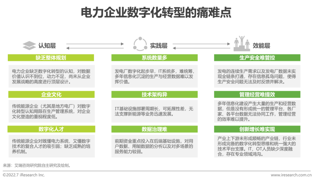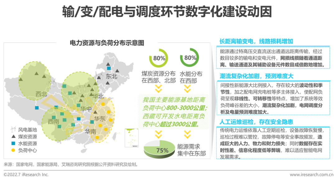 转型关键:电网架起了产能侧与用能侧间的桥梁,不仅关系着自身企业的降本增效,更关系到整个电力系统的优化配置与转型升级。在能源结构转型的背景下,电网数字化转型的关键在于提高电网企业配电和变电的数字化能力,以应对分布式电源的波动性;构建营销平台以挖掘并满足用电侧多元化需求;构建可观、可控的智能电网以保障我国电力供需平衡,赋能双碳目标下新型电力系统建设。我国能源资源与负荷呈现逆向分布,煤炭资源多集中在西部和北部,水能、太阳能主要分布在西北和西南地区,而能源需求则集中在东部。这使得电力能源在长线路、跨区域传输时,面临规划输变电线路、网损线损等问题。此外,随着新型电力系统的建设,风能、水能、太阳能等清洁能源作为电源大比例接入电网,其自身的季节性和间歇性对电网供给的稳定性造成一大挑战。同时,配电网充电桩、分布式能源等多主体接入,也使配网负荷呈现非线性等特点,电网潮流复杂化加大了电网灵活调度与准确预测分析的难度。传统的电网运维很大程度上依靠人工巡检,存在着过程难以管控、安全事故频发、信息化程度低等问题,极易造成巨大的人员与财产损失,难以适应智能电网发展需求,因而急需通过数字化应用减少输变电线损率,提高调配电智能化水平。