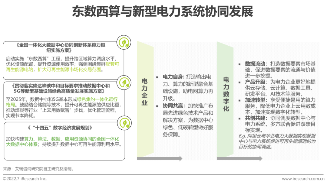 释放绿色电力需求,助力新型电力系统建设及双碳目标实现2022年2月,国家正式启动“东数西算”工程,这一举措对提升国家算力水平、推动区域协调发展至关重要,对电力企业而言更是新的机遇与挑战。一方面,“东数西算”工程涉及数据中心的建设,目前已在8个算力枢纽内规划设立10个数据中心集群、明确绿色节能等目标,未来也会更加集中在西部地区,增强新型电力系统的稳定性以应对削峰调谷的需求。另一方面,“东数西算”有效利用西部地区的可再生能源,将数据中心与电力系统协同调度,降低数据中心能耗和碳排放,促进其绿色低碳发展和“双碳”目标实现。