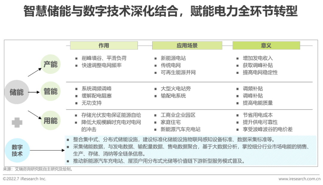 储能与数字技术结合,推动分布式与集中式能源整合平衡储能是保障发电侧、电网侧、用电侧弹性用电的重要支撑工具。储能凭借其快速功率调节和供蓄能力,在平滑间歇式能源功率波动、削锋填谷、改善电压质量及保障电力安全方面均发挥重大作用。2021年8月,国家发改委及能源局发布《关于鼓励可再生能源发电企业自建或购买调峰能力增加并网规模的通知》,鼓励更多发电企业自建储能,构建风光储新型电力系统,加速储能环节联动建设。储能之于电力数字化,如数据存储之于芯片,是电力生产、输配送和消费中不可或缺的一环,储能技术部署的便利性决定能源网络数字化的深度。未来,储能技术将与数字技术深度结合,赋能发/输/变/配/用电全环节,协同推动新型电力系统建设。