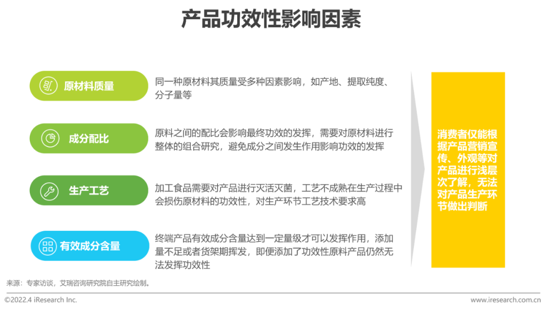 应对策略:优化产品配方、多种功效性原材料复配,弥补单一原材料剂量不足的问题;通过功能性试验证明产品功能,为产品质量背书;与消费者的沟通宣传上,引导其对产品功能合理的心理预期。