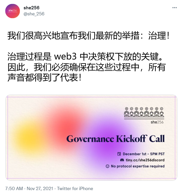 鉴于以上个人代表模式的缺点,我们开始看到事情出现一些变化,从容易“协议政客”化的单个代表,到能代表一组价值观、世界观的投票联盟。一个例子是SHE256 — 一个旨在增加多样性并打破区块链世界准入门槛的组织。在 2021 年 11 月,Ta 们宣布了治理倡议,从一开始就把投票权委任给了三家,Compound、Uniswap 和 ENS: