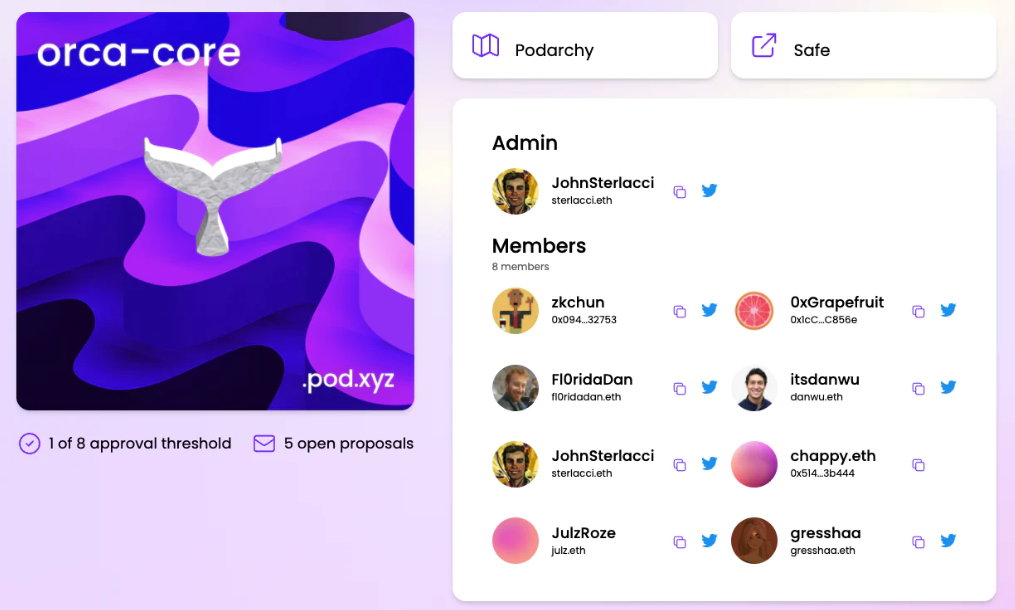 ORCA 协议的 Pod 专门解决此类不透明问题。我们正携手很多治理平台,一同标准化这些组合治理单位和成员的画像,不管从数据结构还是 UI 上,整体效果都保持统一。