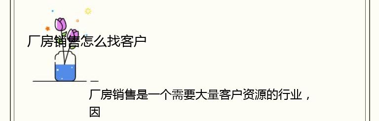 厂房销售是一个需要大量客户资源的行业,因此如何找到客户是非常重要的。以下是一些方法可以帮助您找到潜在客户: