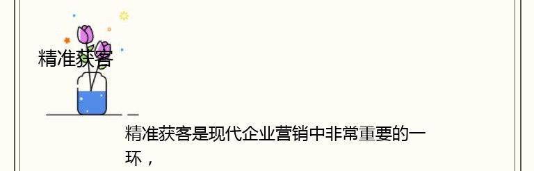 总之,精准获客是企业营销中非常重要的一环,企业需要了解自己的目标客户群体,选择合适的营销渠道,制定有效的营销策略,并不断监测和优化营销效果,以便实现企业的销售目标。