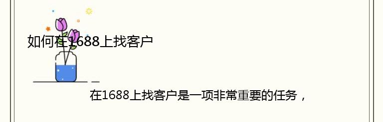 在1688上找客户是一项非常重要的任务,尤其是对于那些想要扩大业务的企业来说。以下是一些有用的技巧,可以帮助您在1688上找到潜在客户。