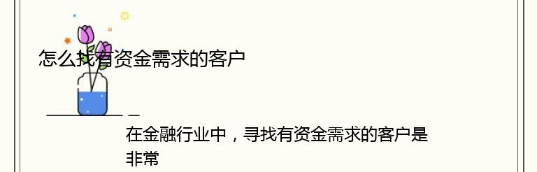 在金融行业中,寻找有资金需求的客户是非常重要的。这些客户需要贷款或其他金融服务来满足他们的需求,而金融机构需要这些客户来维持业务的稳定性和增长。那么,怎么找到这些有资金需求的客户呢?以下是一些方法: