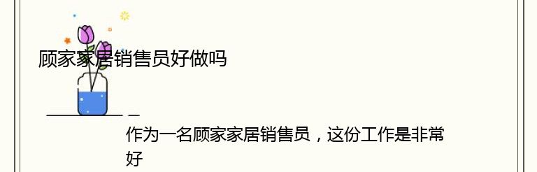 综上所述,作为一名顾家家居销售员,这份工作是非常好做的。我们拥有广泛的客户群体和丰富的产品线,为销售员提供了更多的销售机会和发展空间。同时,我们还为销售员提供了专业的培训和支持,以及良好的工作环境和福利待遇。相信在这样的公司里工作,每一位销售员都能够实现自己的职业梦想。