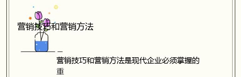 营销技巧和营销方法是现代企业必须掌握的重要技能。在竞争激烈的市场中,只有掌握了营销技巧和营销方法,企业才能在市场中立于不败之地。