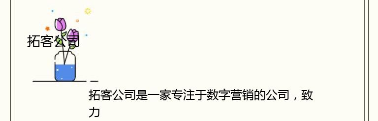 拓客公司是一家专注于数字营销的公司,致力于为客户提供全方位的数字营销解决方案。我们的团队由一群充满激情和创意的专业人士组成,拥有丰富的数字营销经验和技能。