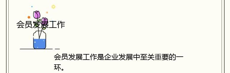 总之,会员发展工作是企业发展中不可或缺的一环。企业需要制定完善的会员发展计划,注重会员的服务质量,不断地开展会员活动,从而吸引更多的会员加入进来,增强会员的忠诚度和满意度,为企业的发展提供有力的支持。