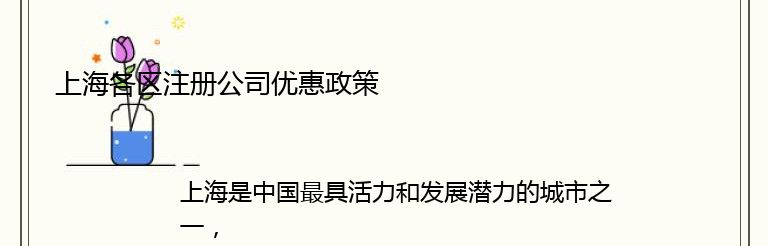 上海是中国最具活力和发展潜力的城市之一,各区**为了吸引更多的企业来此发展,纷纷出台了各种优惠政策,下面就为大家介绍一下各区注册公司的优惠政策。