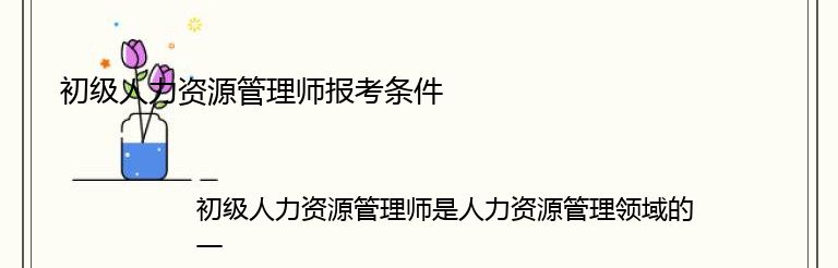 初级人力资源管理师是人力资源管理领域的一项职业资格证书,是国家人力资源和社会保障部门颁发的。报考初级人力资源管理师需要满足以下条件: