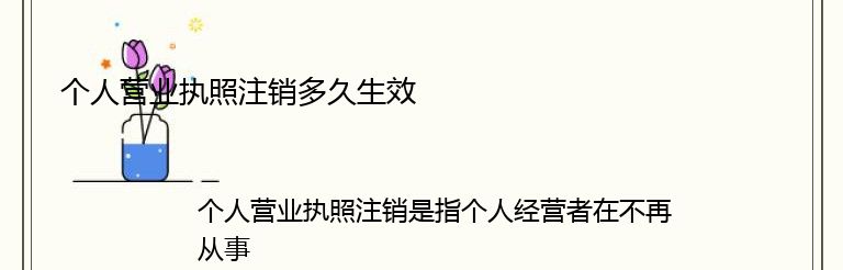 个人营业执照注销是指个人经营者在不再从事经营活动或者经营活动终止后,向工商行政管理部门申请注销个人营业执照的行为。那么,个人营业执照注销多久生效呢?