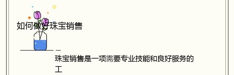 珠宝销售是一项需要专业技能和良好服务的工作。以下是如何做好珠宝销售的几点建议: