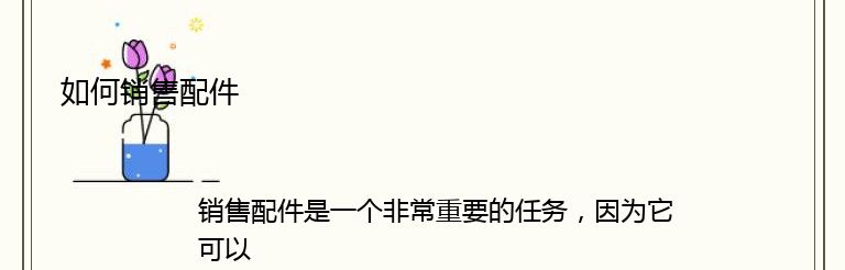 销售配件是一个非常重要的任务,因为它可以为客户提供更好的使用体验,同时也可以为销售人员带来更多的利润。以下是一些关于如何销售配件的建议:
