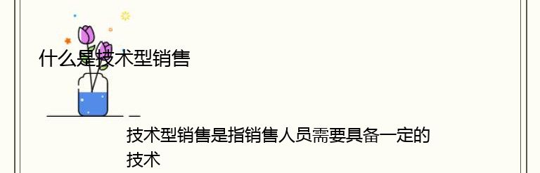 总之,技术型销售是一种需要具备技术知识和技能的销售方式。技术型销售人员需要具备良好的沟通能力、市场分析能力和与技术团队合作的能力,以便能够更好地向客户推销技术产品或服务。