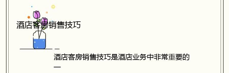 酒店客房销售技巧是酒店业务中非常重要的一环。在酒店客房销售中,需要掌握一些技巧,以提高销售效率和客户满意度。