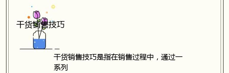 干货销售技巧是指在销售过程中,通过一系列的技巧和方法,提高销售效率和销售质量,从而达到更好的销售业绩。以下是几个干货销售技巧: