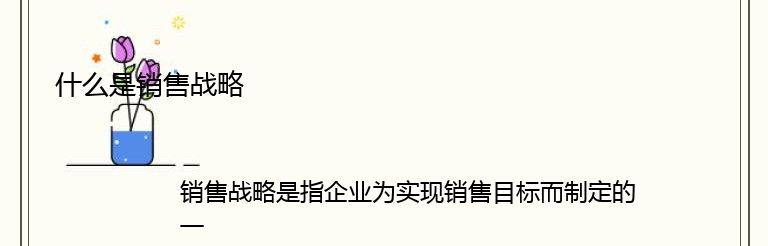 总之,销售战略是企业在市场竞争中获得优势和实现盈利的重要手段。企业需要根据市场环境和自身实际情况,制定科学合理的销售战略,并不断地进行调整和优化,以提高市场竞争力和实现可持续发展。