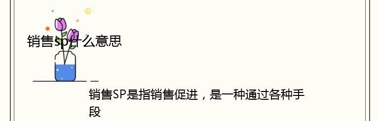 销售SP是指销售促进,是一种通过各种手段来提高销售业绩的方法。SP的目的是为了增加销售量、提高市场份额、提高品牌知名度和提高客户忠诚度。