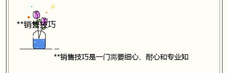 **销售技巧是一门需要细心、耐心和专业知识的艺术。在这个行业中,销售人员需要了解客户的需求和喜好,以便为他们提供最好的产品和服务。