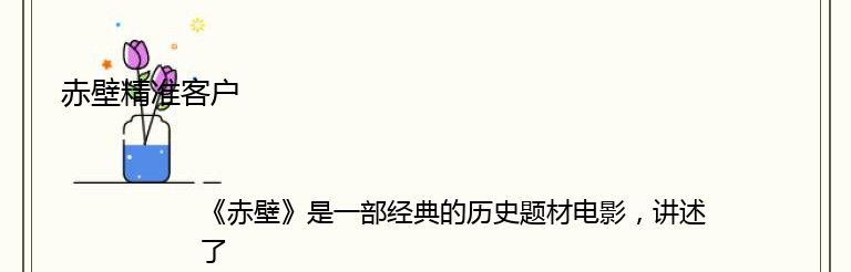 总之,《赤壁》的精准客户是对历史文化、旅游和电影有兴趣的人群。对于相关的产品和服务,他们会产生浓厚的兴趣和需求。因此,对于相关企业来说,要针对这些客户的需求,提供更加精准的产品和服务,才能获得更好的市场表现。