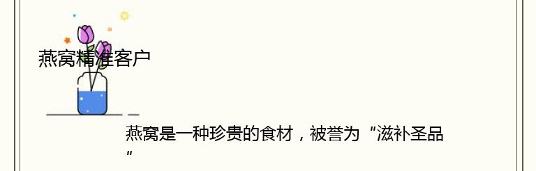 如何找到燕窝精准客户呢?首先,可以通过市场调研和数据分析,了解目标客户的年龄、性别、职业、收入等基本信息,以及他们对燕窝的认知和需求程度。其次,可以通过社交媒体、微信公众号等渠道,发布与燕窝相关的内容,吸引目标客户的关注和参与,建立品牌形象和口碑。还可以通过线上线下的活动和促销,吸引目标客户前来体验和购买产品。