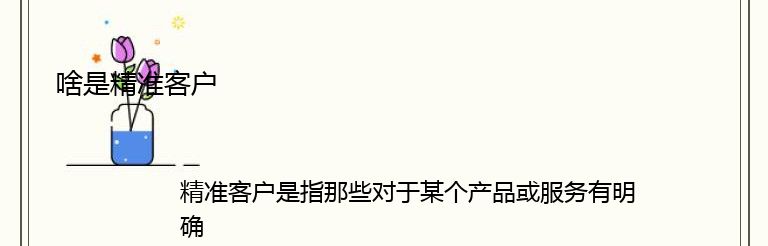总之,精准客户是企业发展的重要资源,企业需要通过市场调研和分析,制定出更加精准的营销策略,为客户提供更加个性化的产品和服务,从而提高客户的满意度和忠诚度,实现企业的可持续发展。