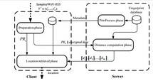 基于WiFi指纹的定位是以服务器为中心的定位算法的典型代表之一。基于WiFi指纹的定位过程一般分为离线训练和在线定位两个阶段。在离线训练阶段,服务提供商在感兴趣的区域中选取若干参考点,测量这些参考点的WiFi指纹(周围AP的信号强度值),并将参考点的位置及其WiFi指纹存入WiFi指纹数据库。在线定位阶段,用户将当前位置的WiFi指纹发送给服务提供商,服务提供商通常找出与用户WiFi指纹欧式距离最近的k个指纹,并根据这k个指纹的位置估计用户的当前位置。这种基于WiFi指纹的定位往往存在位置隐私问题,定位服务提供商在为用户提供定位服务的同时,获取了用户位置。