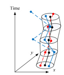 针对轨迹发布场景,Abul等人提出(k,d)匿名泛化方法,对同一段时间内的轨迹数据,按欧式距离进行贪心聚类,直到每个类中至少含有k条轨迹,然后把不在匿名区域(半径为d)的点在最小信息扭曲的前提下,移动到匿名区域内,如图 7所示。Nergiz等人聚类匿名后,在匿名区域内随机选择点进行重构轨迹,发布重构轨迹,具有原始轨迹特性,数据失真相对较小。