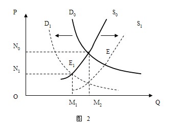 经济学上需求和供给的变动与上段论及的需求量和供给量的变动是有区别的,根据经济学的一般原理,需求和供给的变动是指当商品本身的价格不变时,其他因素的变动所引起的需求量和供给量的变动。表现为整个曲线的移动。如图2所示,当需求减少,需求曲线从D0移到D1时,假定供给曲线S0不变,那么供给和需求的均衡点就会移至E1点,在图象上表现为新的均衡态时,均衡价格比初始时降低了,均衡数量也减少了。假定需求不变,供给增加,供给曲线右移至S1,均衡点移至E2,此时均衡价格比初始时降低了,均衡数量比初始时增加了。