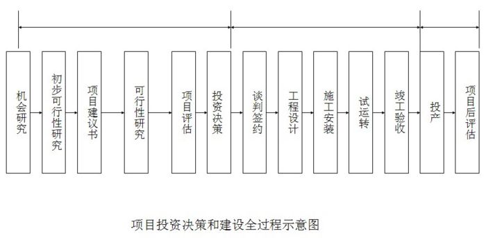 根据联合国工业发展组织编制的《工业可行性研究手册》中拟定的程序,工程项目建设的全过程一般分为投资决策前时期、投资时期和生产运行时期等三个时期。如图7—1所示。可行性研究属于投资决策前时期,又可分为四个阶段:一般分为投资机会选定阶段,进行机会研究;初步选择阶段,进行初步可行性研究;项目拟定阶段,进行详细可行性研究;评价与决策阶段,编写评估报告。现将四个阶段简介如下。