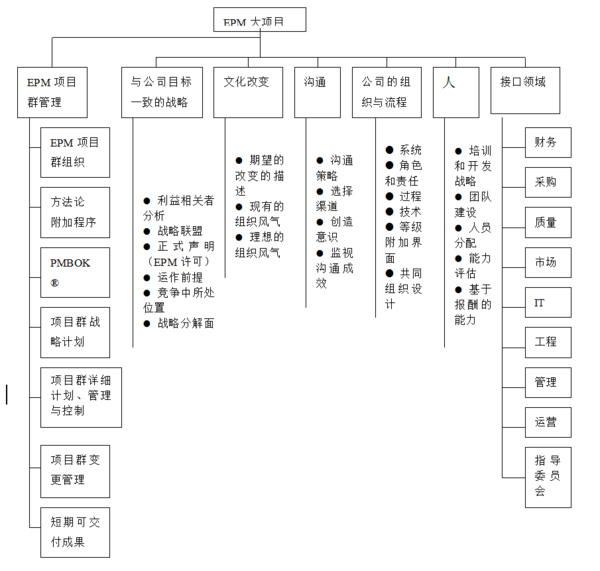 图是一个WBS的例子,该WBS描述了在组织内实施企业项目管理(EPM)的工作,这个WBS是由丁斯莫尔(Dinsmore)开发的,在此作为一个应用实例。