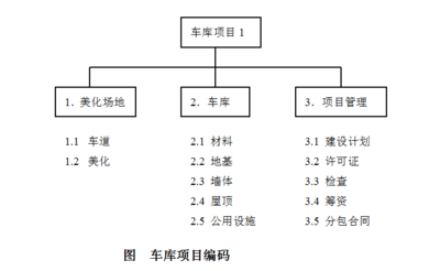 十进制编码系统是精确的、完整的,能够精确到任意一个所需要的层级。车库项目的编码系统如图所示。如果在一个组织中有几个项目,每一个项目中都有相似的WBS元素,可以把词首如GPI(车库项目1)加进来以辨别不同的项目。