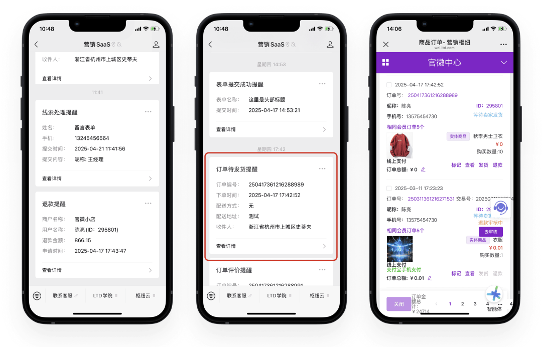 推送效果如下图所示,当这些节点的事件发生时,将通过「营销SaaS」这个微信公众号进行消息推送。点击消息即可快速打开官微中心的对应功能页面,进行细节查看。