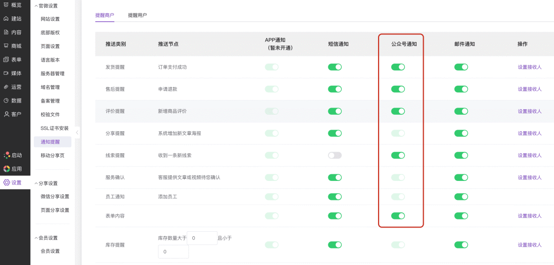 如下图所示,支持公众号通知的推送类型,可以通过红框内的开关进行开启与关闭。开启后,当对应的事件发生时,系统就会自动推送消息。