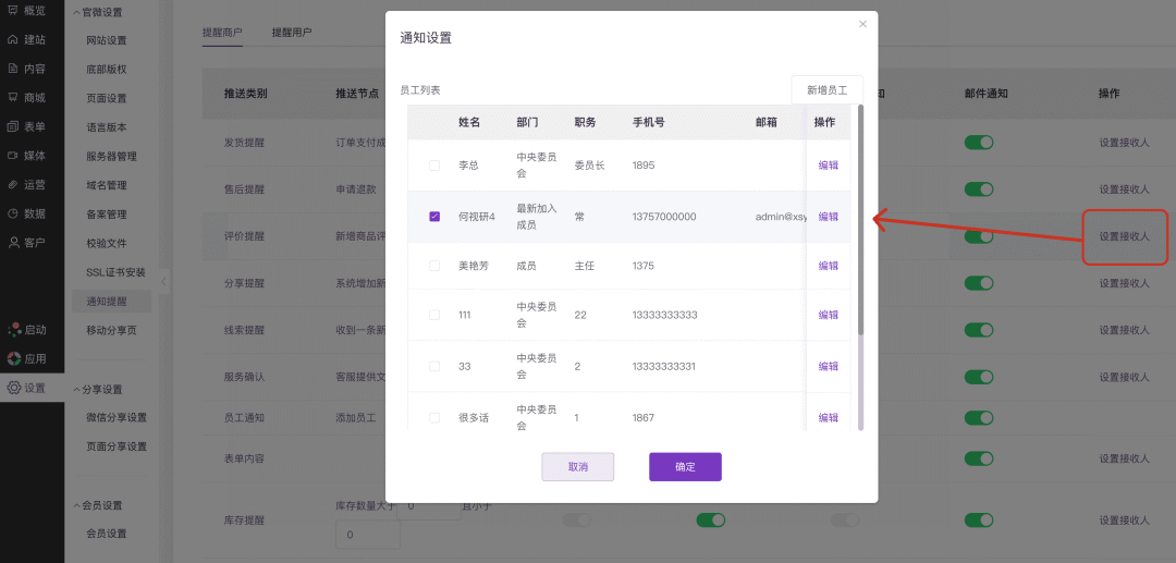 如下图红框内找到「设置接收人」,将需要接收消息的成员勾选即可。此处勾选的成员,除了公众号消息推送外,也将接收短信和邮件方式的通知。