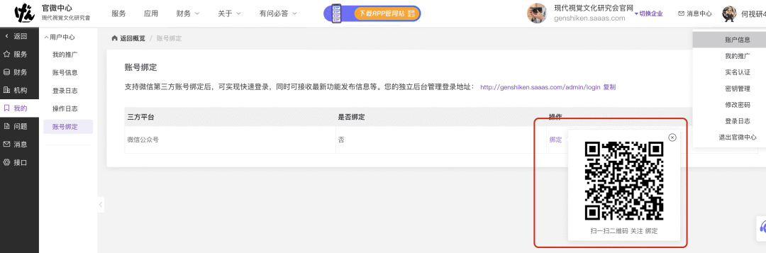 可以通过操作路径:官微中心 - 账户信息 - 我的 - 账号绑定。找到下图中的绑定按钮,扫码关注公众号即可完成。