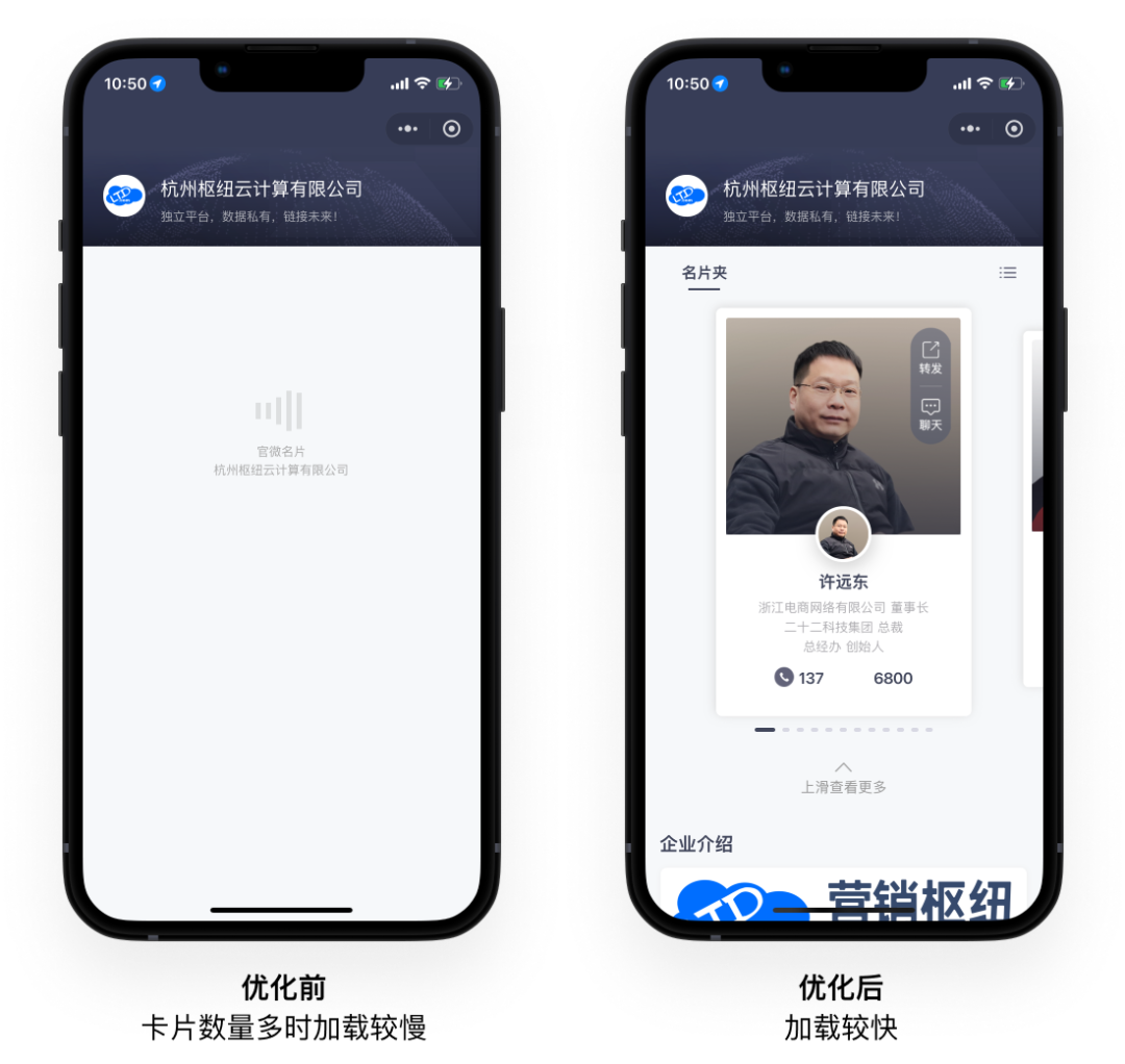 本次升级对名片夹的加载速度做了大幅度提升,令名片小程序打开速度更快。同时,当名片夹中的卡片数量较多时,也能减少加载不出来的概率。