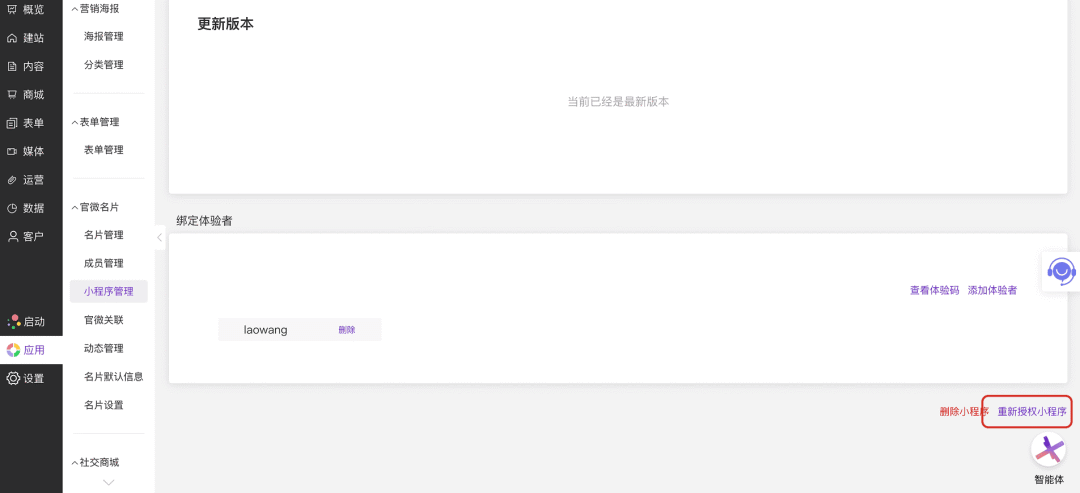 在上次升级中,我们为独立版名片小程序支持使用NFC卡片调起。其中,部分流程需要增加 小程序链接管理 的权限。本次升级我们在独立版名片小程序管理页面增加了「重新授权小程序」的入口,可以通过此处来进行所增加的权限的授权。