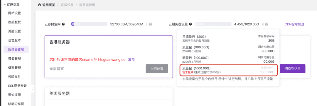 在下图的例子中,该用户在618优惠活动期间续费了两年系统,为了保障两年的顺利使用,他同时为每年都采购了1000G的流量包。此时,他先购买了900G+100G的流量包,当月生效(12个月有效期),用于本年度的系统使用;又另购买了一个明年6月生效(2027年5月到期)的1000G流量包,用于第二年使用。