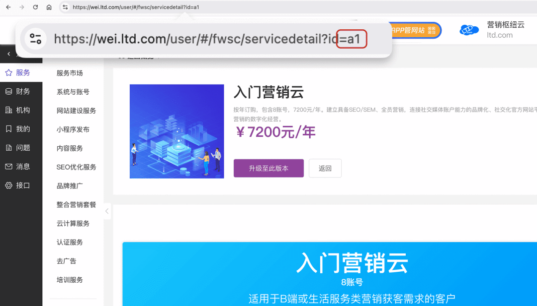 比如下图中,在链接中输入id=a1,也可以直接打开 入门营销云(A1) 版本的详情。