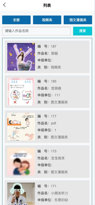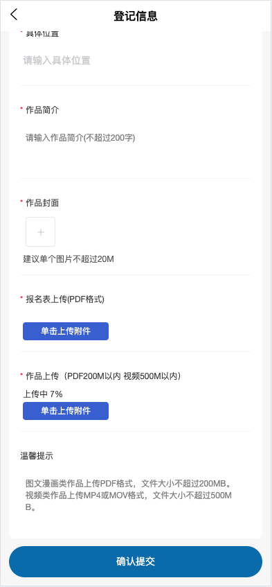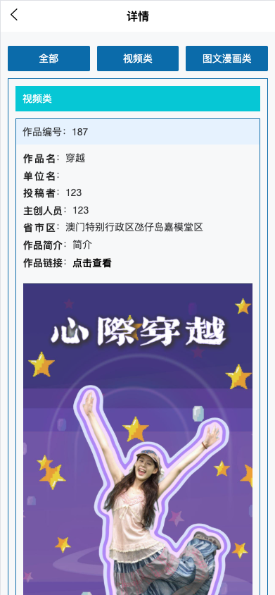 该应用可支持不登录情况下上传较大尺寸的视频/漫画文件进行投稿报名,并且在管理员审核通过后,在大赛公示页面中进行作品展示。