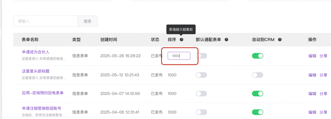 如下图红框内所示,点击排序数字,即可直接在列表界面进行修改。默认的排序值为1000,设置的排序值越大,则该表单的位置越靠前。