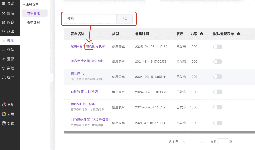 如下图所示,当搜索预约时,将列出所有标题或者简介中包含"预约"这个词的表单。
