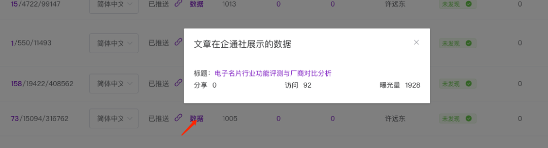 点击下图中的‘数据’按钮,即可展示这篇内容推送到企通社后,得到的分享、访问、曝光量。