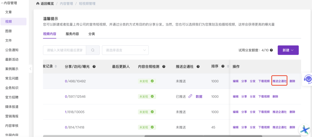 除了文章内容外,本次升级为视频、图册、最新活动、常见问题、业务知识、官方招聘、媒体报道等类型的内容也加上了推送到企通社的功能。