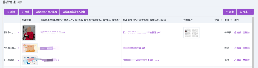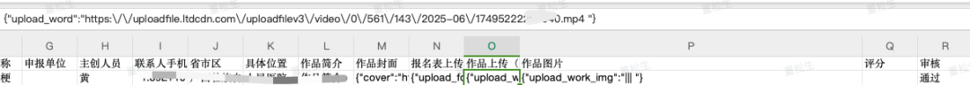 如下图所示,该数据表中存在报名表和作品两个附件字段,访客所上传的附件,都将以文件名+链接的形式在列表中显示。